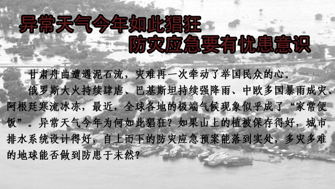 俄羅斯大火持續肆虐、巴基斯坦持續強降雨、中歐多國暴雨成災、阿根廷寒流冰凍,最近,全球各地的極端氣候現象似乎成了“家常便飯”。異常天氣今年為何如此猖狂?多災多難的地球能否做到防患于未然? <詳細>