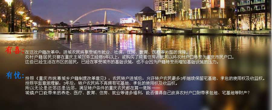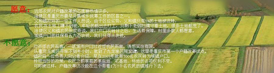 從本月15日開始,重慶市統(tǒng)籌城鄉(xiāng)戶籍制度改革在全市范圍內正式施行。重慶此次大手筆推出的兩年300萬、十年1000萬的農民進城計劃,將成為幾十年來我國戶籍制度改革規(guī)模最大、配套制度設計最完善、影響最深的一次實踐。
