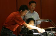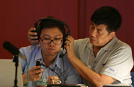 技術中心周俊生給經濟之聲記者黃耀偉戴監聽耳機