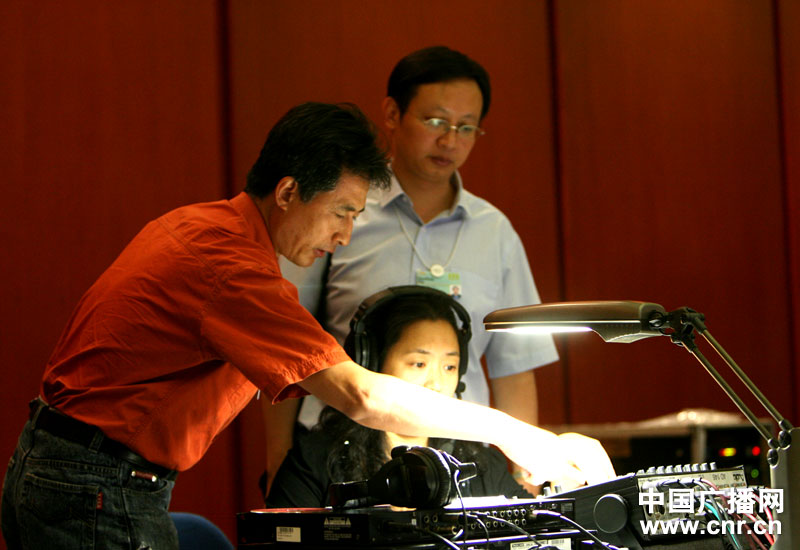 總編室副主任胡國華,技術中心劉宜興與主持人龐瑩調(diào)試直播臺。(中廣網(wǎng)記者 陳曉冉 攝)