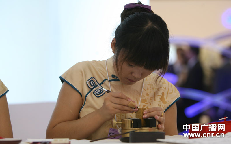 2012夏季達(dá)沃斯論壇在天津梅江會(huì)展中心舉行,除了例行商務(wù)會(huì)議,會(huì)展中心正中中國(guó)傳統(tǒng)文化的展示,吸引了大量來(lái)賓,天津以印刻,茶道,水墨畫(huà),中國(guó)結(jié)這四種傳統(tǒng)的中國(guó)技藝,展現(xiàn)中國(guó)文化的博大精深。留下姓名即可獲贈(zèng)印刻,現(xiàn)場(chǎng)的水墨畫(huà)可以作為紀(jì)念品,中國(guó)結(jié)也是作為禮物送給與會(huì)各方的,而茶品則是休息時(shí)難得的體驗(yàn)。圖為制作印刻的姑娘。(中廣網(wǎng)記者 陳曉冉 攝)