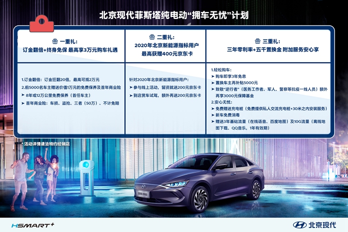 針對獲得2020年北京新能源指標的準車主,只要參與北京現(xiàn)代線上活動,留資并通過驗證即可直接獲得200元京東卡;注冊會員并到店賞車試駕,還可額外獲得200元的京東卡,累計價值400元。此外,消費者還可享受3年免息政策,而對于置換用戶來說,還可在此基礎上獲得5000元置換補貼。特別值得一提的是,為致敬抗擊一線的“逆行者”,包括醫(yī)務工作者、軍人、警察等還可額外享受3000元保障基金。
