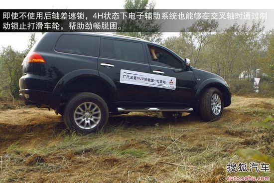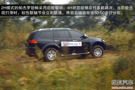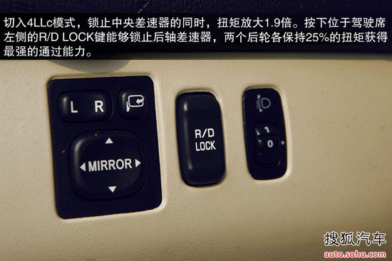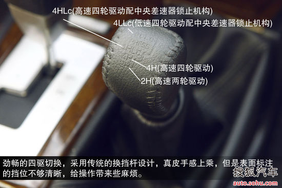 勁暢仍然使用傳統的四驅切換操作桿設計,操作桿與換擋桿采用了相同的真皮包裹,手感上乘。位于皮革表面的四驅檔位標示有些模糊,給初次接觸這套系統的用戶帶來了一些麻煩。其四驅采用三菱的SS4超選四驅系統,提供2H(高速兩輪驅動)、4H(高速四輪驅動)、4HLc(高速四輪驅動配中央差速器鎖止機構)、4LLc(低速四輪驅動配中央差速器鎖止機構)四種模式。