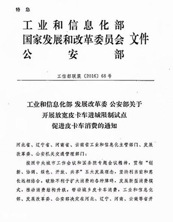 《方案》的緣起是,今年年初工信部、國家發改委和公安部三部門發布《關于開展放寬皮卡車進城限制試點促進皮卡車消費的通知》提出,在河北、遼寧、河南、云南等省開展放寬皮卡車進城限制試點工作。