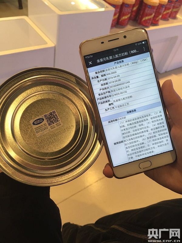 記者通過(guò)對(duì)一罐完達(dá)山奶粉底部的二維碼掃描,即可得出奶粉相關(guān)信息。