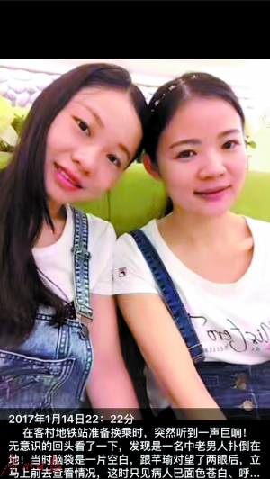 當日22時20分,廣東省第二人民醫院急診科護士唐翌葵和心內三科護士閔芊瑜正從3號線往8號線換乘。正當她們要上扶梯時,10多米開外一名中年男子突然倒下。唐翌葵、閔芊瑜和另外兩名市民趕緊過去幫忙,還有市民去呼叫地鐵工作人員。