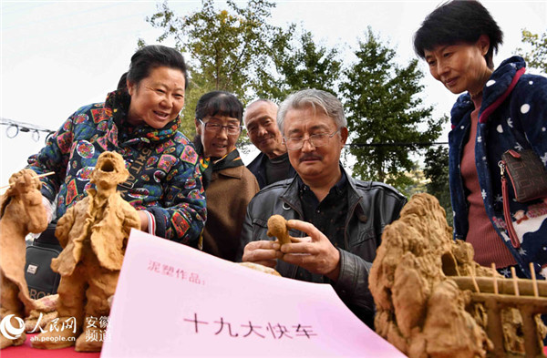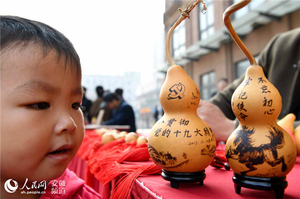 近日,在合肥市瑤海區和平路街道當涂路社區居民文化廣場,居民群眾在欣賞以“黨的十九大精神”為主題的葫蘆烙畫、泥塑、鐵字等非遺手工技藝現場制作及作品展示。