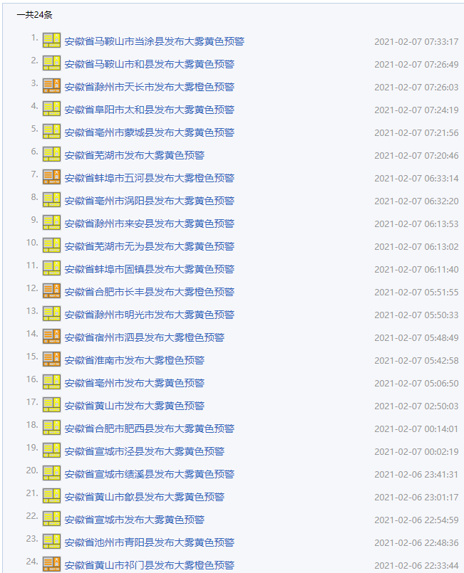 記者注意到,截至2月7日早上7點50分,安徽省有24縣市發(fā)布了大霧預(yù)警。