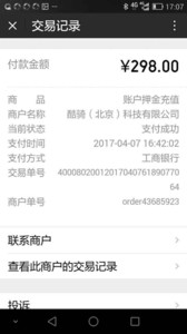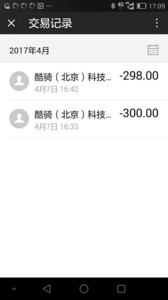 昨日中午,徐女士展示了當(dāng)天所用的手機(jī),上面保留了當(dāng)天交易的各種截圖,從截圖上可以看到,在16:33分和16:42分,她分別被扣款300元和298元。該扣款記錄在微信上還有保留信息,在微信交易記錄中顯示,300元(2元為預(yù)繳騎車(chē)費(fèi))和298元押金被支付給了酷騎(北京)科技有限公司,顯示狀態(tài)為“支付成功”。