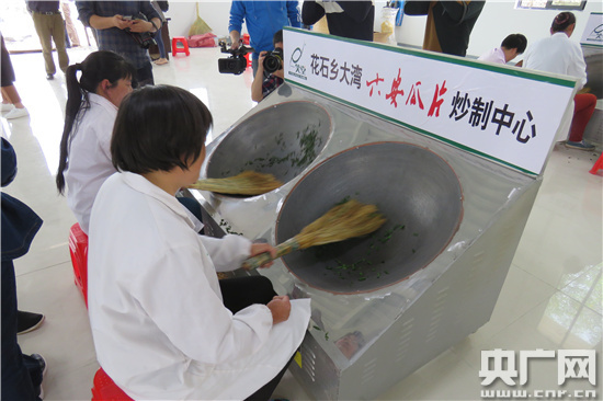 央廣網安徽頻道4月19日六安消息(記者徐秋韻)4月18日,“六安瓜片”炒制實訓班在大灣一笑堂茶廠舉辦,根據金寨縣農業發展委員會統一部署,花石鄉依托一笑堂茶葉公司,給新型職業農民培訓六安瓜片炒制作技能。本次培訓從4月16日即已開始!坝貌璋堰M行翻炒,注意用力適當”,記者在培訓現場也學到了一些與炒茶相關的新名詞。