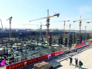 探訪當日,北京晨報記者走過一條長長的甬道來到臨邊防護圍欄前,60萬平方米的超大體量施工現場著實令人震撼。13臺塔吊在施工現場不同部位不停揮動著長臂,完成著一次次超大跨度的運輸吊裝。綠色的運輸卡車正在川流不息地進行著土方回填,一片井井有條的繁忙景象。據現場工作人員介紹,目前,地下結構施工已臨近尾聲,預計5月底前全部完成。