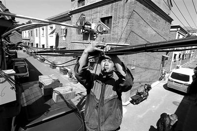 走進西總布胡同,抬頭望去,粗細不一、長短各異的架空線如同蛛網般橫七豎八地覆蓋在胡同上空。“這些密密麻麻的線,有網線、有線電視線、電話線、電力的線,還有路燈線。”東城區城管委市政科孫哲說。