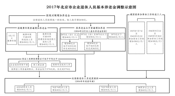自2017年1月1日起,北京市城鄉(xiāng)居民基礎(chǔ)養(yǎng)老金和老年保障福利養(yǎng)老金每人每月增加50元。基礎(chǔ)養(yǎng)老金由每人每月510元提高到每人每月560元;老年保障福利養(yǎng)老金由每人每月425元提高到475元。此次調(diào)整從今年1月1日起開始執(zhí)行,在7月底之前發(fā)放到位。