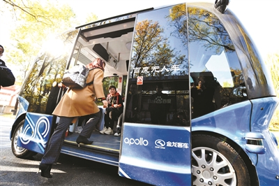 3日,北京青年報記者來到海淀公園,最引人注目的當屬一輛無人駕駛擺渡車——“阿波龍”小巴車。據(jù)現(xiàn)場負責人介紹,這款車是由百度、金龍客車、英特爾合作生產(chǎn)的全國首輛商用級無人駕駛微循環(huán)電動車,充一次電可行駛100多公里。目前,“阿波龍”提供公園西門與兒童游樂園之間的接駁服務,全程1公里左右,一個往返在15至20分鐘,游客可通過關注“AI未來公園”微信公眾號進行免費預約體驗。