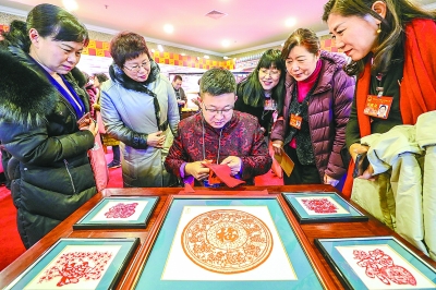 1月13日,“為民族傳承,為生活創(chuàng)新——北京市非物質(zhì)文化遺產(chǎn)保護(hù)工作成果展”在市十五屆人大二次會議代表駐地舉行,非遺傳承人為代表們展示剪紙技藝。本報(bào)記者武亦彬 攝