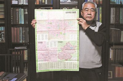 北平解放時的第一張地圖《最新北平大地圖》、1950年的《中華人民共和國大地圖》《亞洲人民反帝斗爭圖》……北京收藏家協會常務理事、70多歲的魏有華老人書房的墻面,幾乎被裝著鏡框的老地圖填滿。為便于讀圖,魏老將一張正方形餐桌改造成閱圖平臺,臺面上是厚厚的幾摞老地圖。自1981年從地攤上花5毛錢買下的1971年《北京交通圖》開始,至今魏老已收藏地圖3000余件套。接受北青報記者采訪前,他將一張有40年歷史的《北京市區交通圖》放在了最上層。