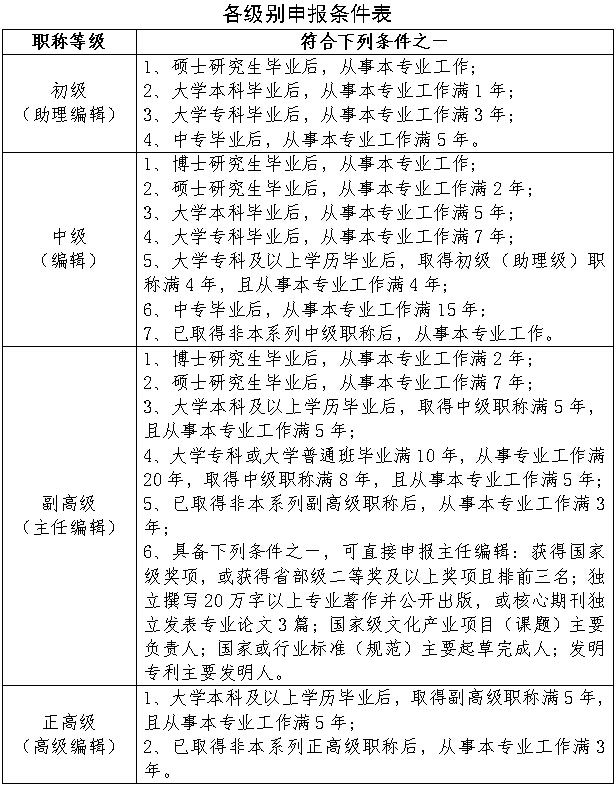 在職稱等級及名稱設置上,職稱等級從高到低依次設置為:正高級、副高級、中級、初級(助理級)四個等級,各級別專業技術資格名稱分別為:高級編輯、主任編輯、編輯、助理編輯等。