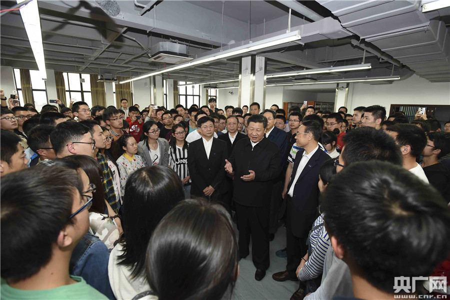4月26日下午,習近平總書記來到中國科技大學圖書館自習室,同學生愉快交談。(新華社記者李濤 李學仁/攝) 央廣網合肥4月26日消息(記者劉樂)4月26日下午,習近平總書記來到中國科技大學圖書館自習室。見到總書記來了,學生們圍攏過來,爭著向總書記問好。“家是哪里的?一個人來合肥上大學爸媽放心嗎?”“國防班有多少人?招生時就定向了吧?”“去西部地區支教這一年感受很深吧?農村的孩子,不忘初衷。”“在圖書館學習覺得氛圍很好吧?還得早點來占個座?”總書記同身邊的學生愉快交談著。大家你一言我一語回答總書記提出的問題,談自己的大學生活,講人生的目標理想。 聽了同學們的話,總書記說,過去中國人口多、人手多,現在正轉變成人才多。建設制造業強國、實現“兩個一百年”奮斗目標,教育是基礎。我們對中國建設國際一流大學、培養國際一流人才充滿自信。我們的胸襟是開放的,包容并蓄。幸福不是從天降,中國人民取得的成就是很了不起的,不要妄自菲薄,同時要自強不息。年青人在學校要心無旁騖,學成文武藝,報效祖國和人民,報效中華民族。同學們好好學吧! -