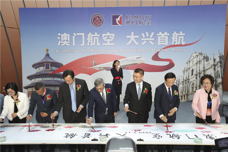 北京大興首航澳門儀式上,嘉賓共同繪就美好畫卷(航空公司供圖)