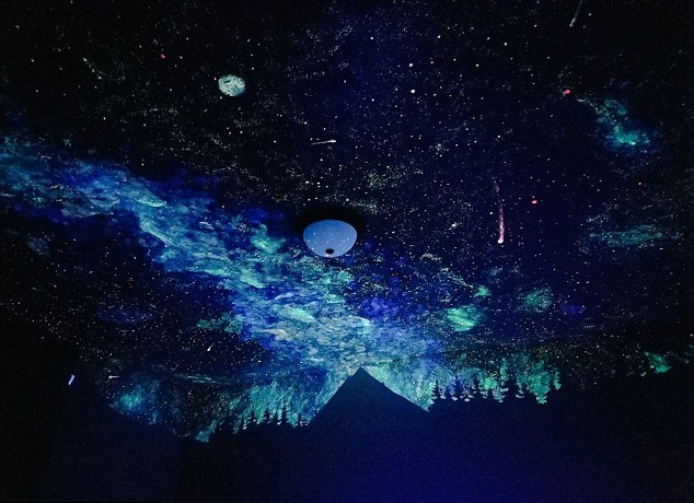 克里斯平說:“繪制墻面的油漆在白天看不見,只能在黑暗中發(fā)光,所以我只能在微暗的房間里,踩在結(jié)實(shí)的梯子上伴著音樂繪畫。”她還做了針葉林模板,用藍(lán)色膠帶貼在天花板下方。當(dāng)燈光熄滅的時(shí)候,一抬頭就能看見璀璨的星空。