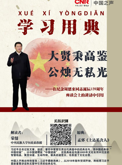 中國之聲特別策劃《習近平最新用典》,梳理習近平最新重要講話和文章中引用的經典名句。今天的《習近平最新用典》,請看習近平在紀念周恩來誕辰120周年座談會上的講話中使用的“大賢秉高鑒,公燭無私光”。解讀嘉賓:中央民族大學歷史系教授蒙曼。