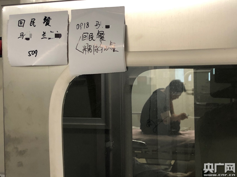 6月16日,北京地壇醫院第五病區,透過貼有供餐需求的消毒傳遞柜,可以看到患者正在病床上看手機(中央廣播電視總臺央廣記者 白杰戈 攝)