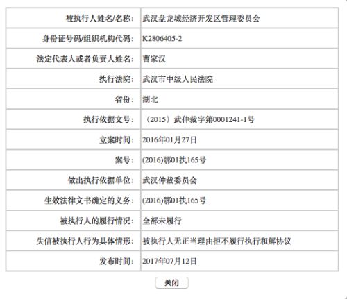 湖北省委巡視組已經(jīng)介入此案的執(zhí)行。2017年7月12日,武漢市中院就將盤龍城經(jīng)開區(qū)管委會和其法人代表曹家漢列入失信被執(zhí)行人名單。武漢市中院方面表示,不排除刑拘曹家漢的可能。一位法律界人士指出,法院仍有限制被執(zhí)行人高消費、拘留法定代表人和直接責任人,以及按照拒不執(zhí)行法院判決裁定罪問責等強制措施沒有實施。