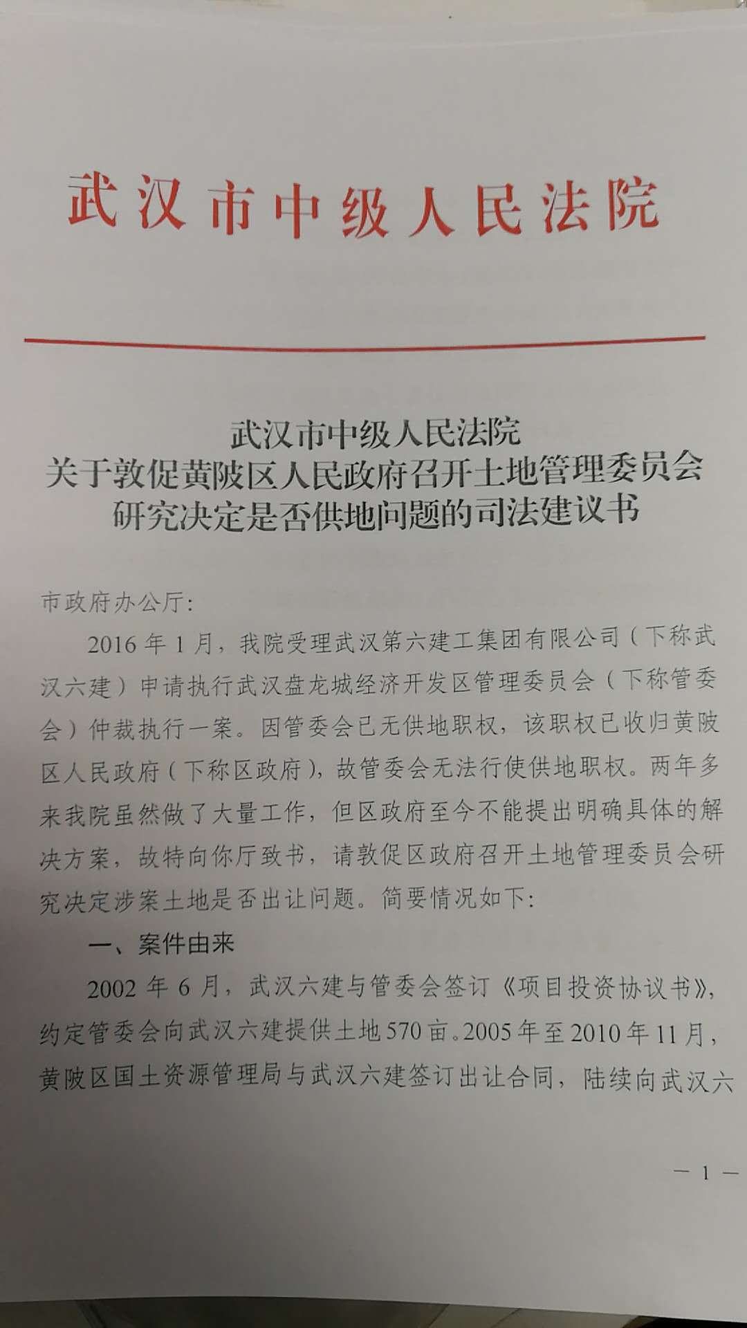 黃陂灄口經(jīng)濟發(fā)展區(qū)2003年更名為武漢盤龍城經(jīng)濟開發(fā)區(qū),黃陂第六建筑有限公司后來也更名為武漢第六建工集團有限公司。協(xié)議約定的是出讓400畝,但到2010年,政府只為其辦理了200多畝的土地和規(guī)劃手續(xù)。雙方出現(xiàn)供地糾紛,按照協(xié)議約定,提請武漢仲裁委員會仲裁。2015年12月,武漢六建打贏了官司,但遭遇執(zhí)行難。目前,武漢市中院已三次發(fā)出敦促履行的通知書,最高法院也督辦兩次,武漢市委政法委也召開了專題會議,要求黃陂區(qū)政府盡快依法行政,但黃陂區(qū)政府仍未履行生效裁定。黃陂區(qū)政府主管副區(qū)長丁朝輝稱,中國之聲的報道播出后,區(qū)里第一時間開了專題會議。黃陂區(qū)委區(qū)政府非常重視,書記和區(qū)長都親自參加了專題會議。區(qū)政府的相關負責人和盤龍城開發(fā)區(qū)的主要負責人約見了六建公司的法人代表,雙方進行了坦誠和務實地交流。