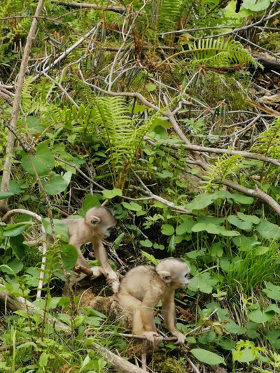 風(fēng)聲、鳥(niǎo)聲、樹(shù)葉聲,夾雜著短促的嘶鳴。獨(dú)屬于山間的精靈忽然跳入眼簾,雄猴頂著一頭金紅的披肩、灰藍(lán)色的臉孔,威風(fēng)凜凜地在林間騰躍,剛剛出生的小猴則害羞地往猴媽媽懷里鉆。一只渾身淺金色絨毛的小猴拉扯著我的鞋帶,忽閃著清澈的大眼睛定定地看著我。