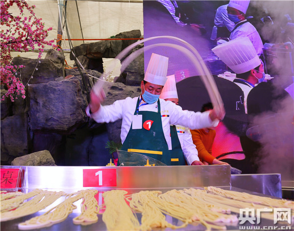 馬乙拉四的隊友馬福文正在制作拉面,面前的案板上有已經拉好的各種面型,供評委評鑒(央廣記者 葛修遠 攝)
