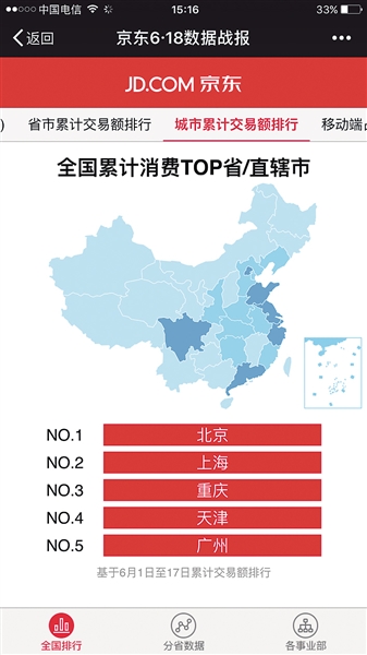截至昨天下午3點(diǎn),京東宣布在始于6月1日的京東6·18全民年中購物節(jié)期間,京東商城累計下單金額已超1100億元。而重慶在累計銷售額榜上,排名全國第三,僅次于北京、上海。同時,在這場網(wǎng)購盛宴上,更多的重慶造、重慶產(chǎn)通過京東走出重慶,走出國門。