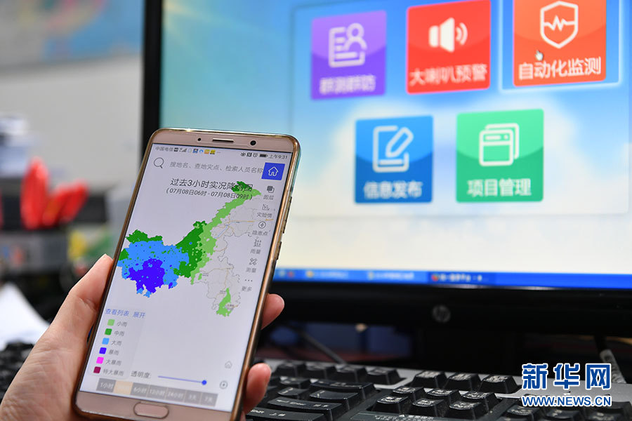 陳良斌、魏德勇、黃荀、向青松是重慶市南岸區僅有的四名地質“體檢師”,每天上班的第一件事,便是通過手機查看當地的降雨情況。同時,通過監測系統,了解當地最新的風險走向。新華網發(郭旭 攝)
