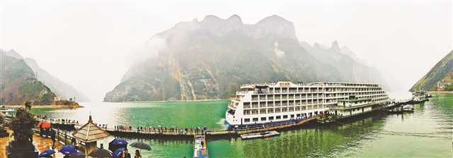 2019年3月13日,在長(zhǎng)江三峽巫山境內(nèi)的巫峽,一艘豪華游輪停靠在神女峰旅游碼頭。通訊員 盧先慶 攝