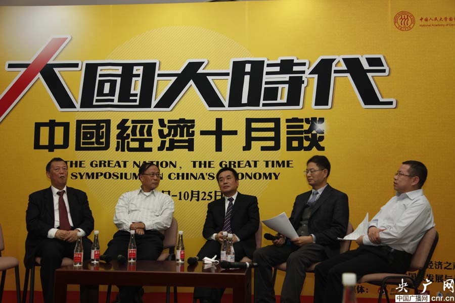 10月16日,由經濟之聲、央廣網主辦的《大國大時代----中國經濟十月談》系列時事報告會之四“價格談”,在人民大學舉行。圖為圖為國務院參事室特約研究員姚景源、國家信息中心首席經濟師范劍平、國家發(fā)改委價格司副司長周望軍、中國人民大學財政金融學院副院長趙錫軍、經濟之聲觀察員陳愛海(由左至右排序)(央廣網 趙娜娜/攝)