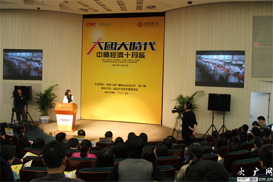 1023日,由中央人民廣播電臺經濟之聲、央廣網主辦的《大國大時代----中國經濟十月談》系列時事報告會之八“社會談”,在北大光華管理學院阿里巴巴報告廳舉行。今天的主題是《社會談:改革需要多少個配套窗口?》。圖為報告會現場。(央廣網 于琦/攝)