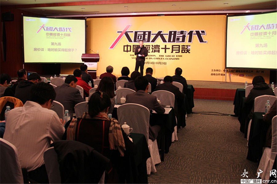 1024日,由中央人民廣播電臺經濟之聲、央廣網主辦的《大國大時代----中國經濟十月談》系列時事報告會之九“房價談”,在廣電國際酒店舉行。今天的主題是《房價談:啥時能買得起房子?》。圖為報告會現場。(央廣網 于琦/攝)