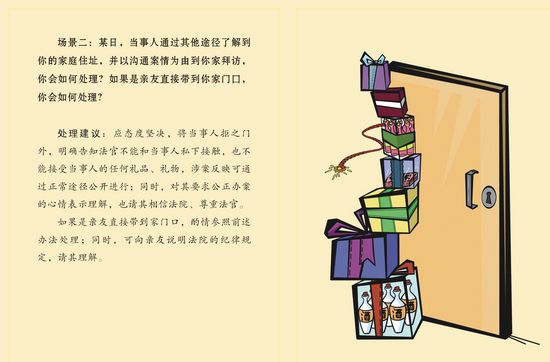 最近,浙江省法院的每位干警都收到了一本“拒腐”手冊,手冊模擬了24種法官在辦案中可能遇到的送禮、請托的場景,并給出了處理建議:收到老鄉(xiāng)送的土特產(chǎn),可回贈一定的土特產(chǎn)或禮品;飯局遇到當(dāng)事人應(yīng)設(shè)法借故離開等等。手冊還配以各種通俗易懂的反腐倡廉漫畫作為補(bǔ)白。浙江省高院院長齊奇表示,面對說情送禮,法官冷冰冰、硬邦邦地簡單拒絕可能導(dǎo)致與親朋好友斷絕往來。因此,要柔性處理,藝術(shù)拒絕。