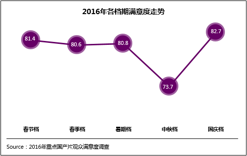 2016年國慶檔以15.79億元票房、5083萬人次的成績落幕。票房雖然較2015年“史上最強國慶檔”的18.6億元票房有差距,但觀眾滿意度卻不降反升,足以顯見,中國電影界追求創作質量的努力正在逐步顯現成果。