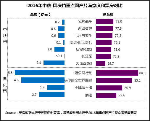 從中秋、國慶兩個檔期整體看來,主旋律電影表現搶眼,兩部動作類型片《我的戰爭》和《湄公河行動》均為檔期滿意度第一名。其中改編自真實事件的《湄公河行動》以性格飽滿的硬漢人物及激情熱血的動作打斗強勢圈粉,成為國慶檔滿意度冠軍的同時,票房也一路飆升最終登頂。