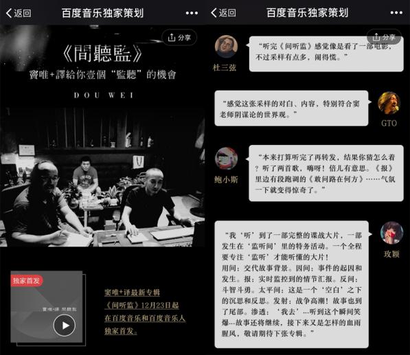 23日專(zhuān)輯首發(fā)后,百度音樂(lè)就發(fā)起了“竇唯+譯給你一個(gè)‘監(jiān)聽(tīng)’的機(jī)會(huì)”專(zhuān)題活動(dòng),引導(dǎo)用戶發(fā)布從《間聽(tīng)監(jiān)》中“監(jiān)聽(tīng)”到的內(nèi)容評(píng)論,不少人都在專(zhuān)題后留下了自己的感受。