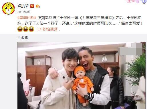 2月21日,據(jù)博主“娛扒爺”爆料,王俊凱近日碰到王大陸,一見面,他就送了王大陸一個“孩子”——當然是個公仔娃娃啦,然后還調侃說王大陸?zhàn)I了可以吃。
