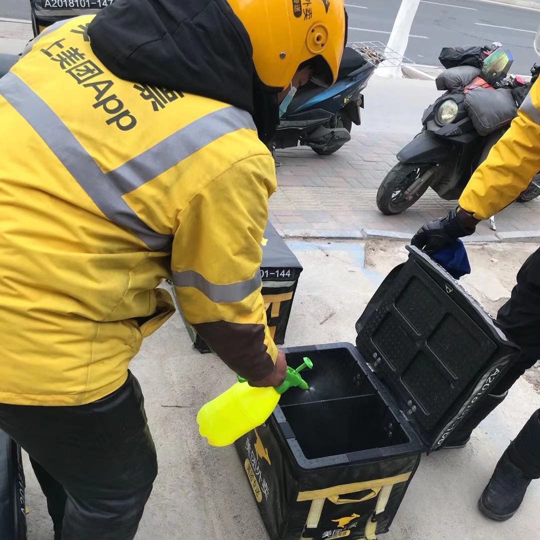 (石家莊騎手正在使用消毒液對配送箱進行消毒)
