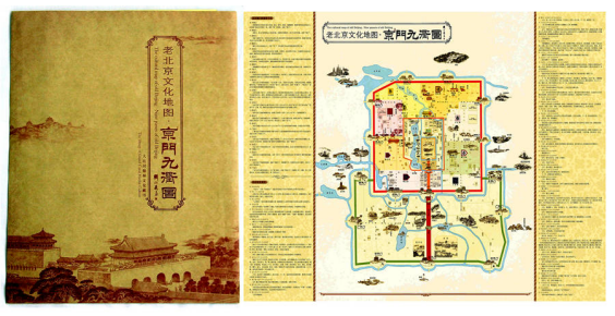 ◆地圖正面采用二維形式將紫禁城的宮殿格局、“內(nèi)九外七皇城四”二十座城門及北京各條道路更直觀的展示出來(lái),并將北京文物古跡及景點(diǎn)采用國(guó)畫小圖形式添加在相應(yīng)地理位置。兩側(cè)用文字講述了北京城門的前生今世、北京歷史變遷等。圖文搭配可以讓人更直觀的了解老北京歷史格局。