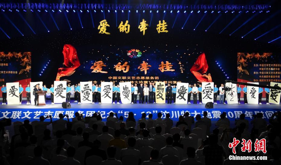 5月7日晚,“5.12”汶川特大地震10周年之際,中國文聯(lián)組織文藝名家走進四川綿陽,拉開了“愛的牽掛”序幕。活動現(xiàn)場,志愿者們贈送了12幅寫著“愛”字的書法作品,同時還贈送攝影和書畫作品。張國立、張凱麗、康輝、張蕾、姜昆、張也、李丹陽、呂繼宏、佟麗婭、霍勇等藝術家以文藝志愿者身份,現(xiàn)場為觀眾獻上了精彩的文藝表演。據(jù)悉,為更好地服務廣大攝影愛好者,中國攝影家協(xié)會慰問小分隊還深入北川等地舉辦攝影培訓講座,吸引了當?shù)馗鹘缑癖姶?000余人參加。劉忠俊 攝