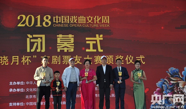 央廣網北京10月8日消息(記者王子衿 安紅麗)10月7日下午,北京園博園三號門廣場鑼鼓陣陣,2018中國戲曲文化周閉幕式暨“曉月杯”京劇票友大賽(以下簡稱票友大賽)頒獎儀式舉行,大賽總決賽金銀銅獎及各項單項獎揭曉,鄭蘭菊、田建才、張蘭芝從成人組勝出,少兒組、海外組金獎分別由程柯睿、Antti Silvennoinen摘得。