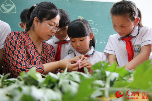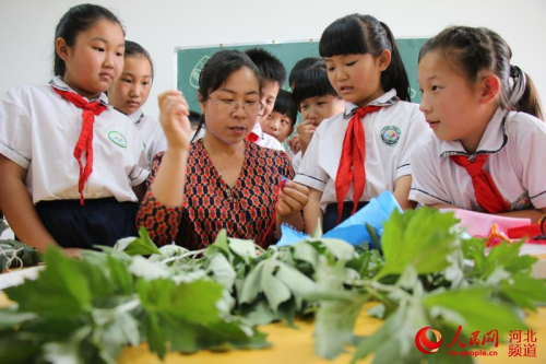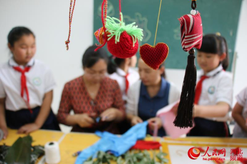 圖為6月4日河北省邯鄲市廣平縣第二實驗小學學生在老師的幫助下縫制香囊。