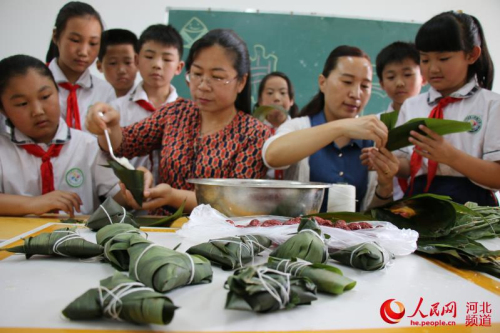 圖為6月4日河北省邯鄲市廣平縣第二實驗小學學生在老師的幫助下學習包粽子。