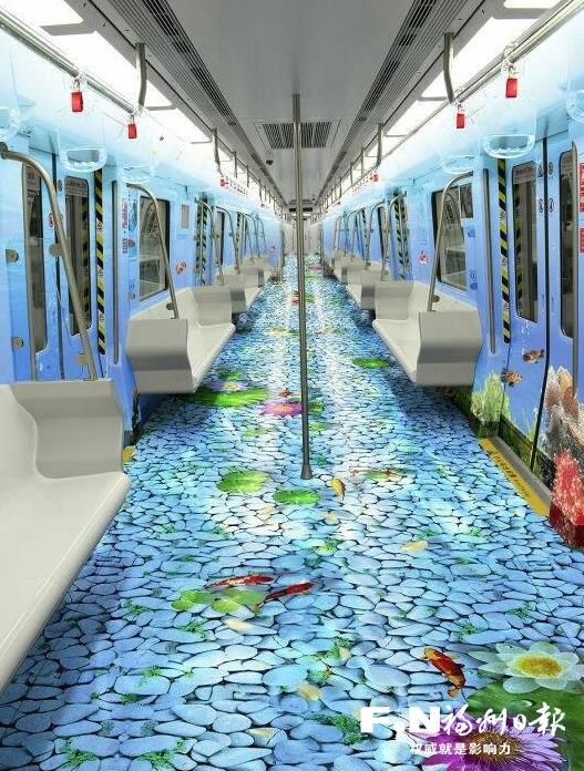 微博博主“福州地鐵迷”發布了幾張地鐵列車內的照片,并配文:“福州地鐵新彩繪車廂出爐,這次以清新靈動為創意主線,主題為金魚,小鐵感覺,仿佛到了水族館。”在3張照片中,記者看到,車廂兩側整體為藍色調,腳下“鋪滿”鵝卵石,多尾形態、顏色各異的金魚在水草間歡快游動。