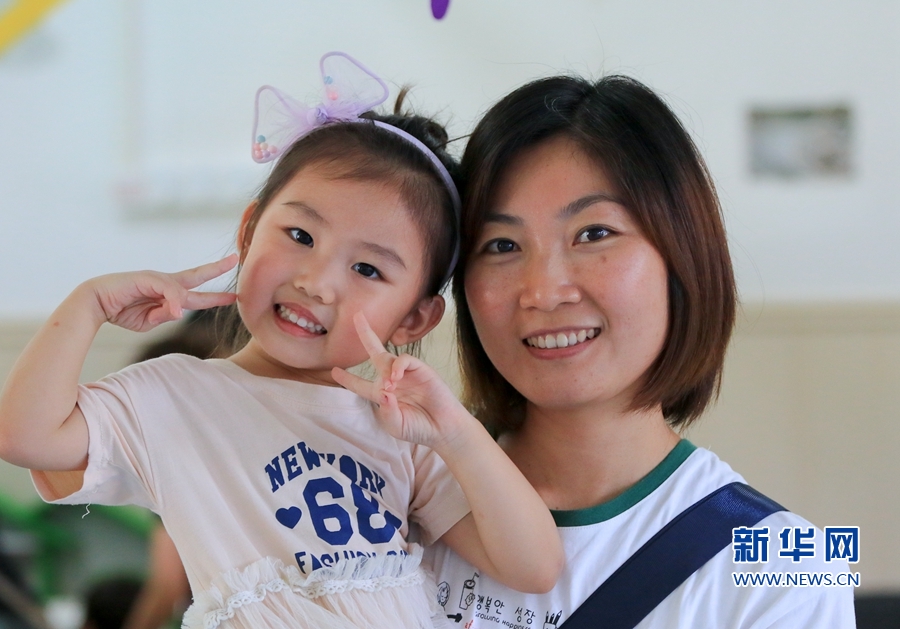 一名小女孩在媽媽的鼓勵下參加互動游戲。新華網 肖和勇 攝 -