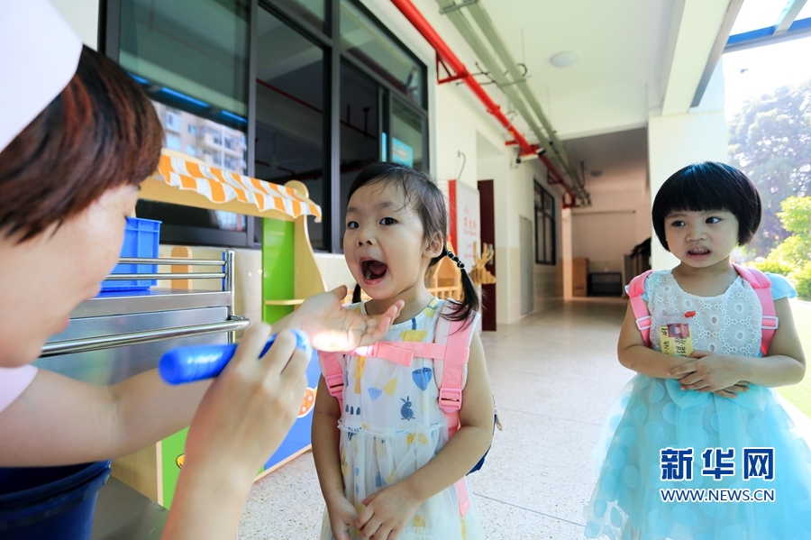 開園第一天的晨檢,讓小朋友有些意外。但這更像一個儀式,其意義在于幫助孩子們養成健康、衛生的生活習慣。新華網 肖和勇 攝 -